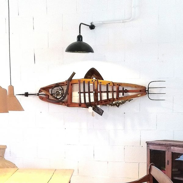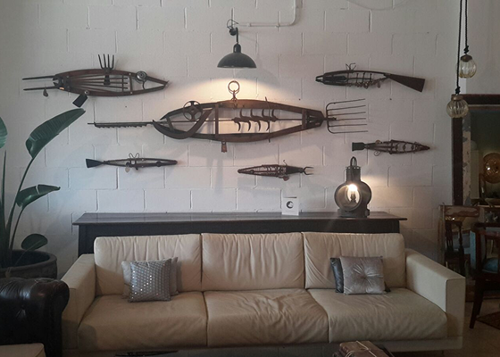 Peces realizados en madera de Teca y utensilios de labranza ,mecánica, etc. Formando esculturas decorativas.
