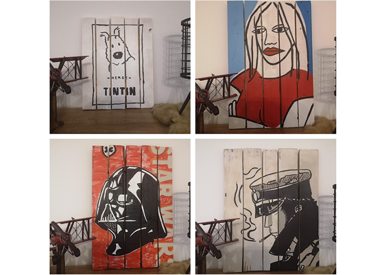 Cuadros realizados con madera de pallets, diferentes temas, comic, motor, peces, etc.